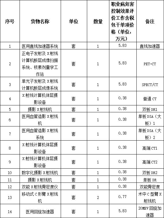 1.1.2服務(wù)內(nèi)容: 綿陽三江醫(yī)院項目(一期)職業(yè)病危害控制效果評價工作全部工作內(nèi)容:進行現(xiàn)場驗收檢測并編制職業(yè)病危害放射防護控制效果評價工作報告書,協(xié)調(diào)市衛(wèi)健部門召開職業(yè)病危害控制效果評價工作報告專家審核會議,通過專家評審,并最終取得批復(fù)。具體設(shè)備如下: