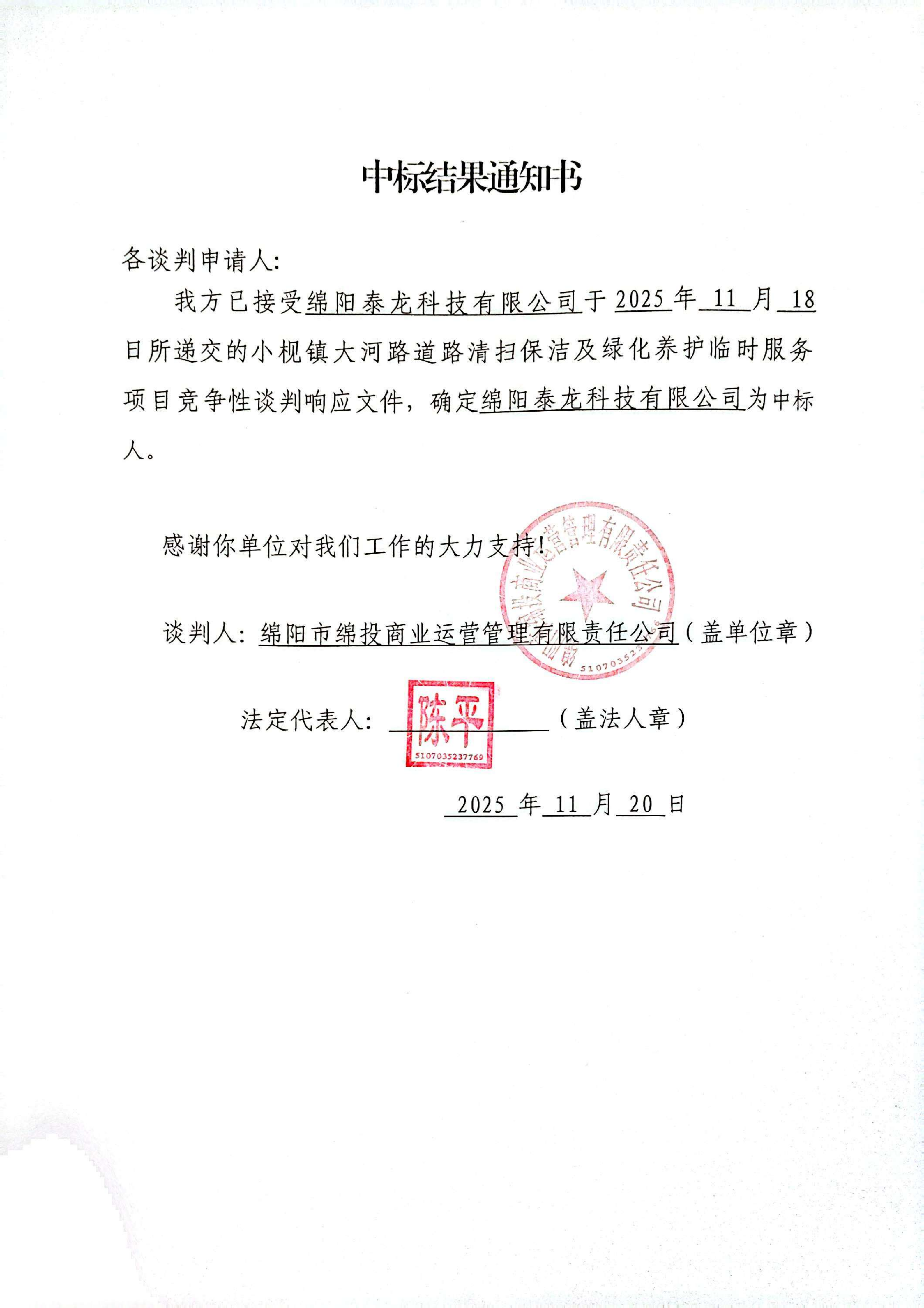 我方已接受綿陽泰龍科技有限公司于2025年 11 月 18 日所遞交的小枧鎮(zhèn)大河路道路清掃保潔及綠化養(yǎng)護(hù)臨時(shí)服務(wù)項(xiàng)目競爭性談判響應(yīng)文件,確定綿陽泰龍科技有限公司為中標(biāo)人。