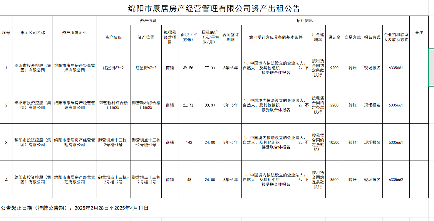 綿陽(yáng)市康居房產(chǎn)經(jīng)營(yíng)管理有限公司資產(chǎn)出租公告