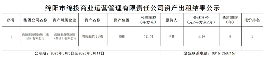 綿陽市綿投商業(yè)運營管理有限責(zé)任公司資產(chǎn)出租結(jié)果公示