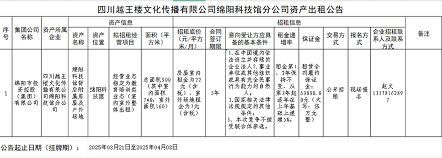 四川越王樓文化傳播有限公司綿陽科技館分公司資產(chǎn)出租公告