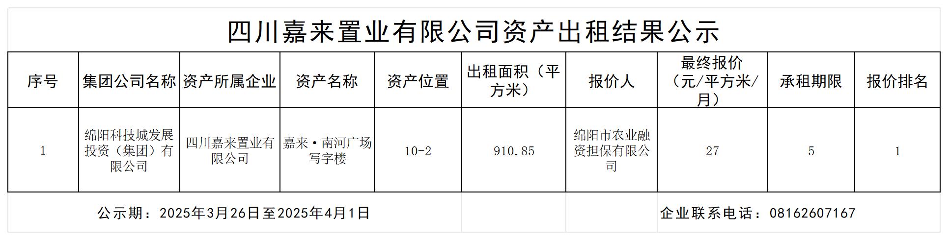四川嘉來置業(yè)有限公司資產出租結果公示