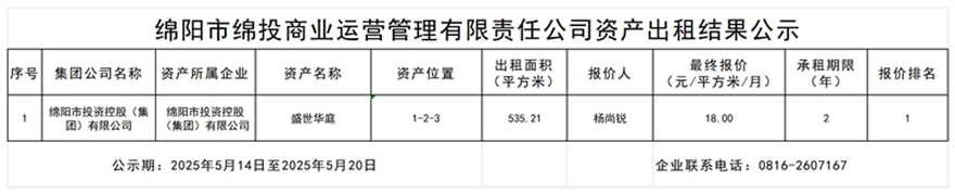 綿陽市綿投商業(yè)運營管理有限責(zé)任公司資產(chǎn)出租結(jié)果公示
