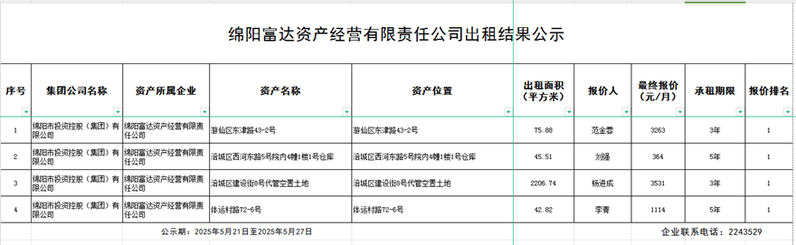 綿陽富達資產(chǎn)經(jīng)營有限公司出租結果公示
