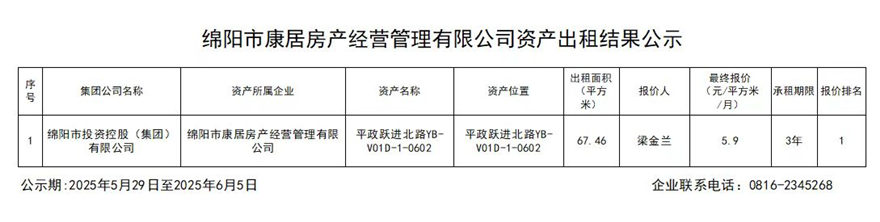 綿陽市康居房產(chǎn)經(jīng)營管理有限公司資產(chǎn)出租結(jié)果公示