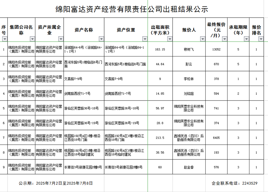 綿陽富達資產(chǎn)經(jīng)營有限責任公司出租結(jié)果公示
