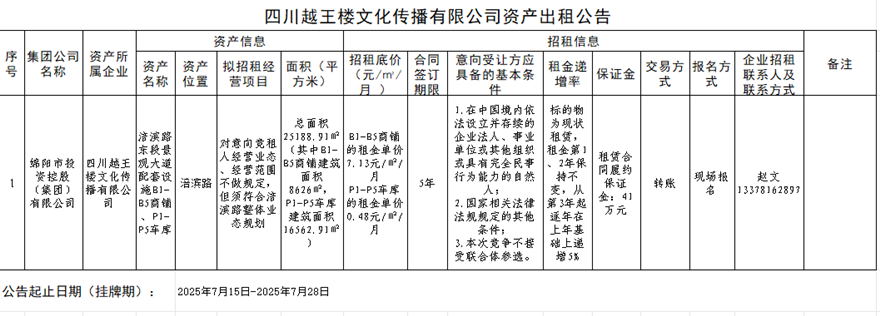 四川越王樓文化傳播有限公司資產(chǎn)出租公告