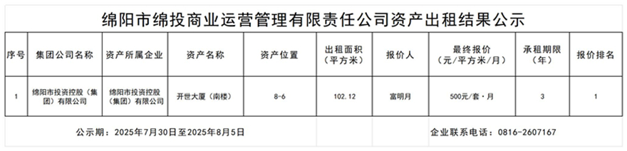 綿陽市綿投商業(yè)運營管理有限責(zé)任公司資產(chǎn)出租結(jié)果公示