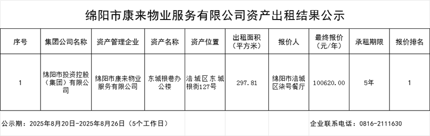 綿陽市康來物業(yè)服務(wù)有限公司資產(chǎn)出租結(jié)果公示