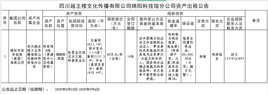 四川越王樓文化傳播有限公司綿陽科技城分公司資產(chǎn)出租公告