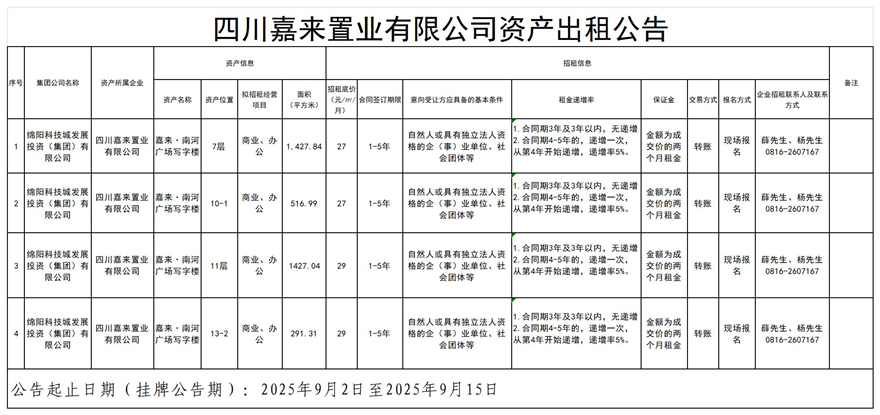 四川嘉來置業(yè)有限公司資產(chǎn)出租公告