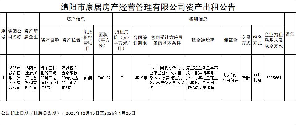 綿陽市康居房產(chǎn)經(jīng)營管理有限公司資產(chǎn)出租公告