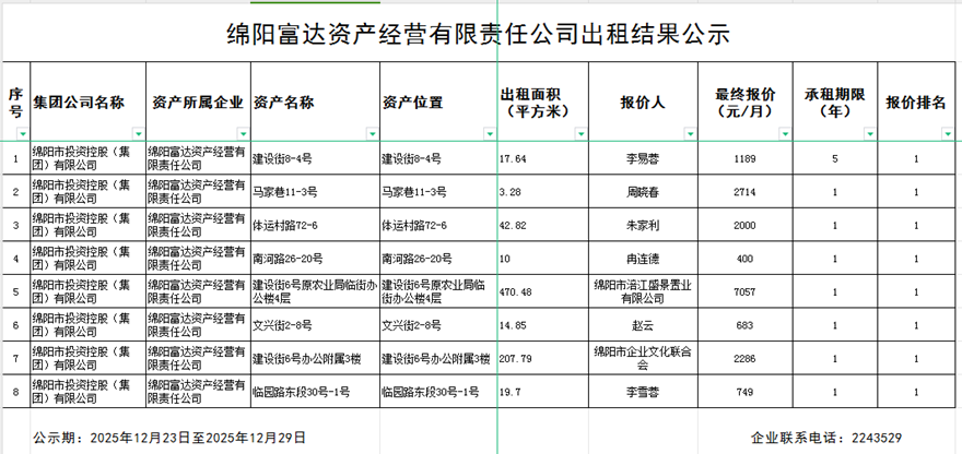 綿陽富達資產(chǎn)經(jīng)營有限責任公司出租結(jié)果公示