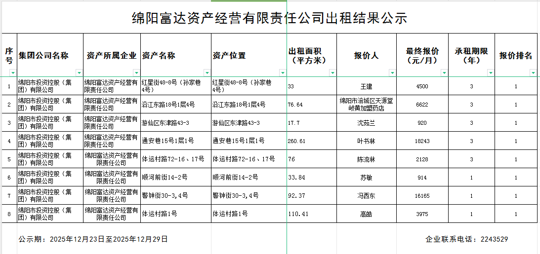 綿陽富達(dá)資產(chǎn)經(jīng)營有限責(zé)任公司出租結(jié)果公示