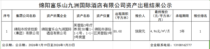 綿陽(yáng)富樂(lè)山九洲國(guó)際酒店有限公司資產(chǎn)出租結(jié)果公示