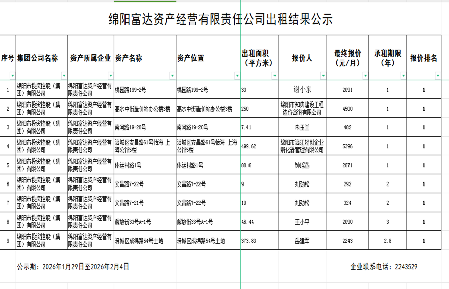 綿陽富達(dá)資產(chǎn)經(jīng)營(yíng)有限責(zé)任公司資產(chǎn)出租結(jié)果公示