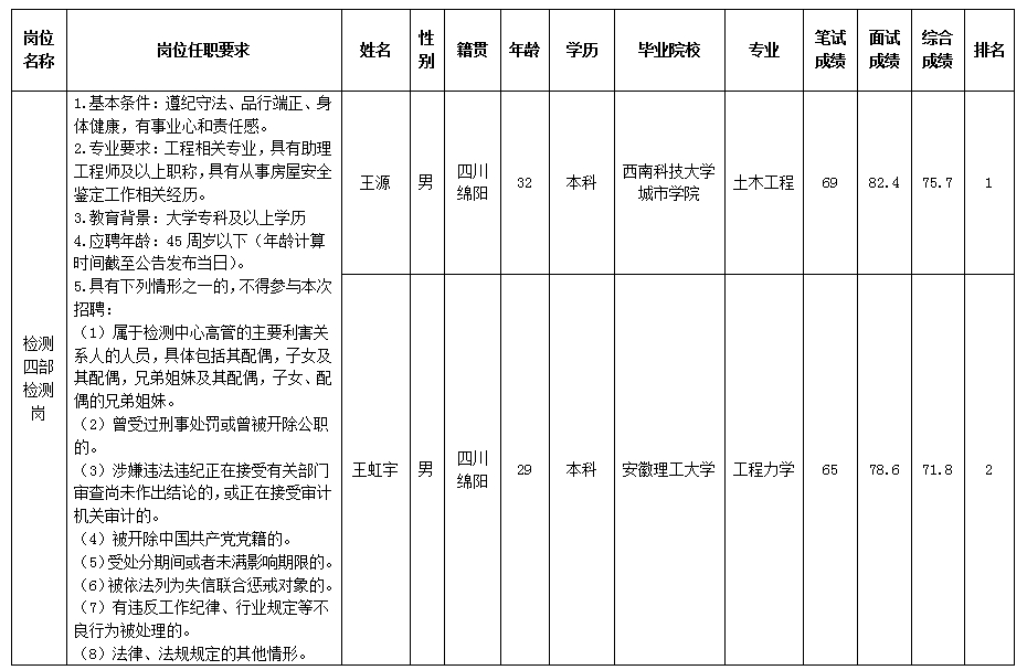 根據(jù)綿陽市建設(shè)工程質(zhì)量檢測中心有限責(zé)任公司發(fā)布的招聘公告及招聘相關(guān)規(guī)定,現(xiàn)將筆試、面試成績予以公示。