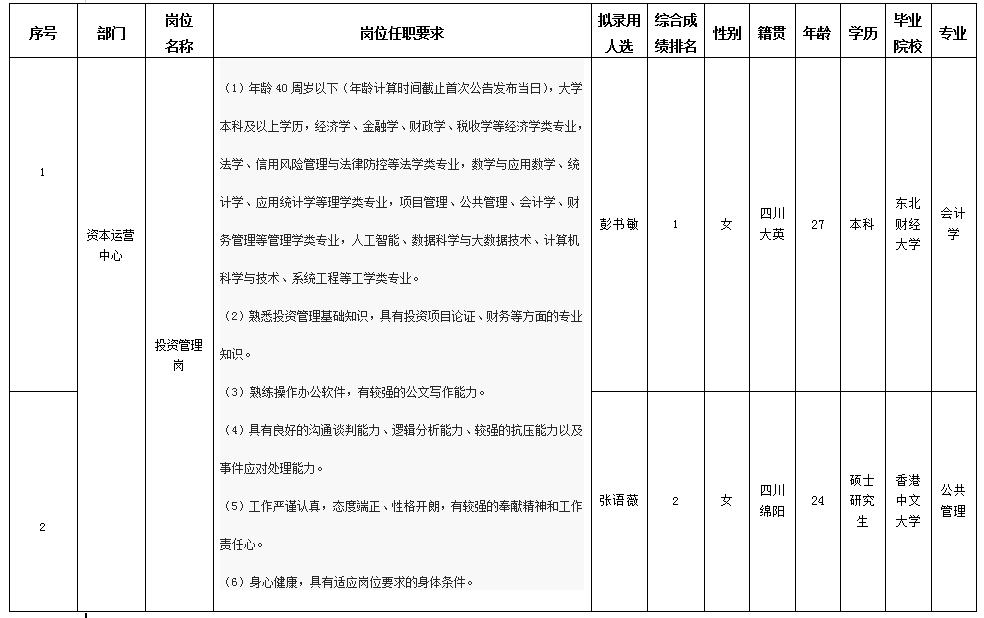 根據(jù)綿陽(yáng)市投資控股(集團(tuán))有限公司發(fā)布的招聘公告及招聘相關(guān)規(guī)定,經(jīng)筆試、面試、考察、體檢等程序,擬錄用彭書(shū)敏等同志到綿陽(yáng)市投資控股(集團(tuán))有限公司工作,現(xiàn)予以公示,具體情況如下: