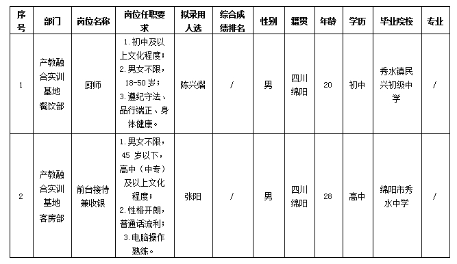 根據(jù)綿陽市綿州嘉來會務服務有限公司發(fā)布的招聘公告及招聘相關規(guī)定,經面試、體檢等程序,擬錄用陳興熠、張陽同志到產教融合實訓基地餐飲部、客房部工作,現(xiàn)予以公示,具體情況如下: