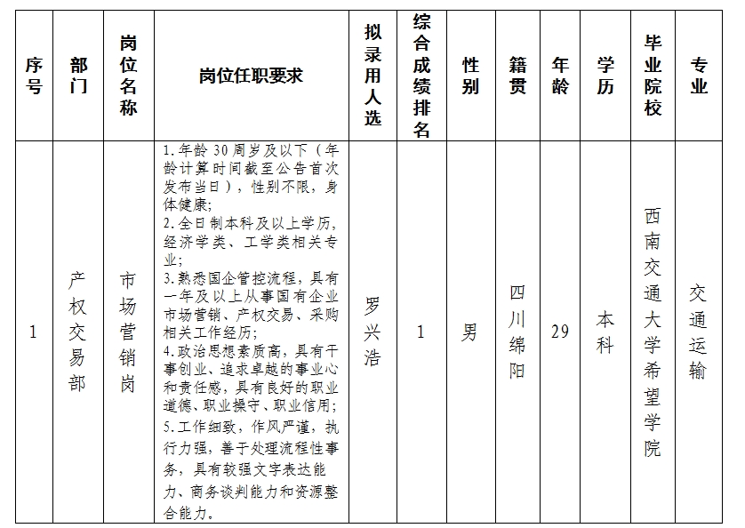 根據(jù)綿陽市綿投商業(yè)運(yùn)營管理有限責(zé)任公司發(fā)布的招聘公告及招聘相關(guān)規(guī)定,經(jīng)筆試、面試、考察、體檢等程序,擬錄用羅興浩同志到產(chǎn)權(quán)交易部工作,現(xiàn)予以公示,具體情況如下: