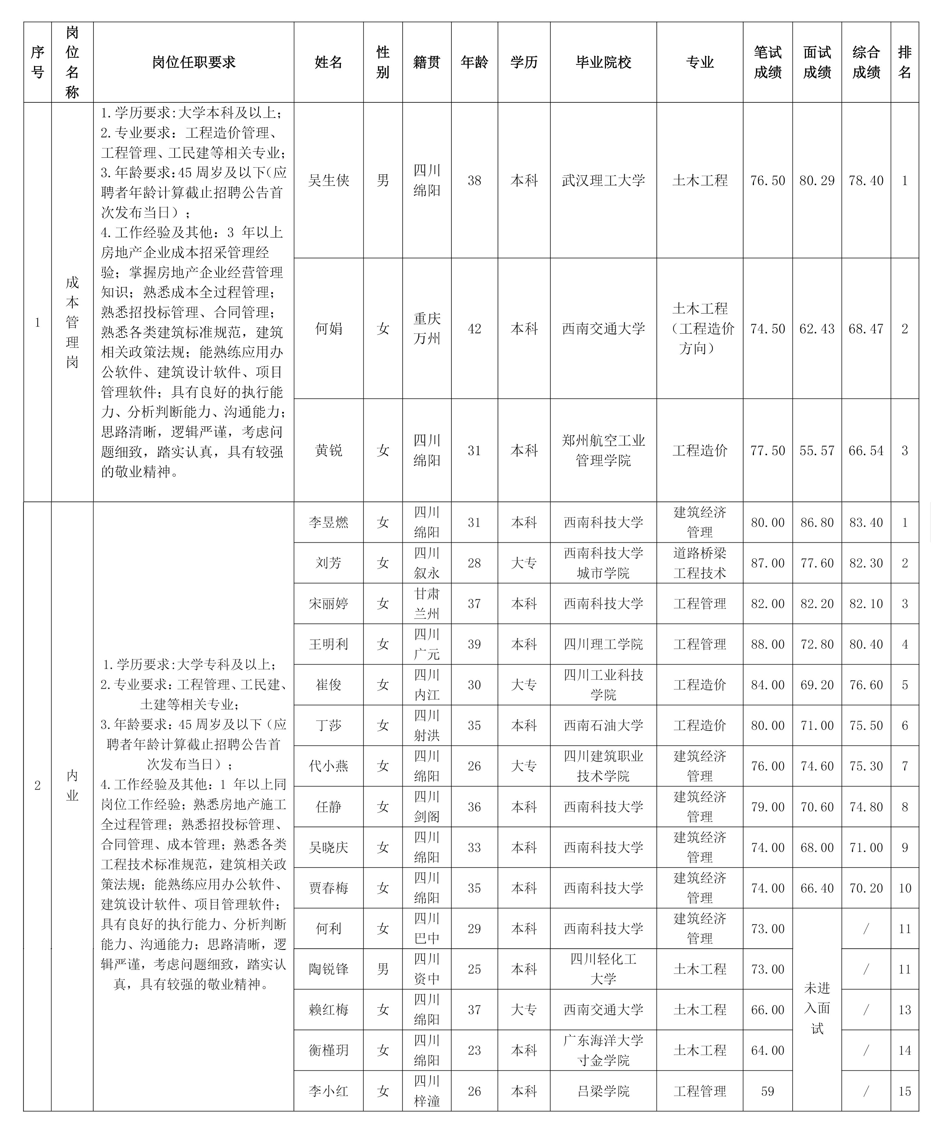 根據(jù)綿陽市綿投置地有限公司發(fā)布的招聘公告及招聘相關(guān)規(guī)定,經(jīng)筆試、面試等程序,現(xiàn)將筆試、面試成績予以公示。
