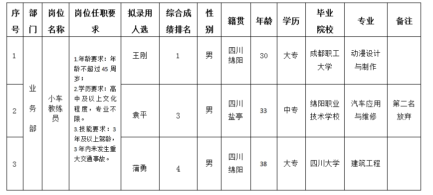根據(jù)綿陽市汽車實(shí)驗(yàn)駕駛技術(shù)學(xué)校股份有限公司發(fā)布的招聘公告及招聘相關(guān)規(guī)定,經(jīng)實(shí)操、面試、考察、體檢等程序,擬錄用王剛等3位同志到綿陽市汽車實(shí)驗(yàn)駕駛技術(shù)學(xué)校股份有限公司工作,現(xiàn)予以公示,具體情況如下: