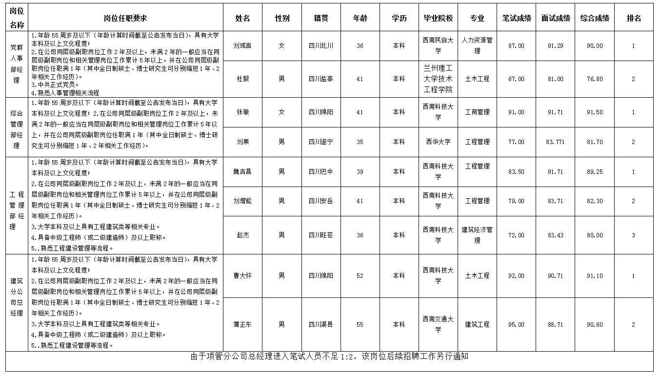 根據(jù)四川嘉來建筑工程有限公司發(fā)布的中層競聘公告及相關(guān)規(guī)定,經(jīng)筆試、面試等程序,現(xiàn)將綜合成績予以公示。