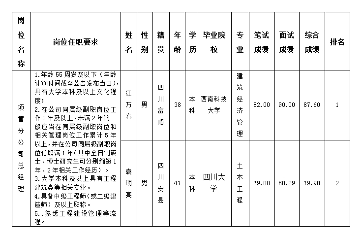 根據(jù)四川嘉來(lái)建筑工程有限公司發(fā)布的延長(zhǎng)項(xiàng)目管理分公司總經(jīng)理崗位報(bào)名時(shí)間的公告及相關(guān)規(guī)定,經(jīng)筆試、面試等程序,現(xiàn)將綜合成績(jī)予以公示。