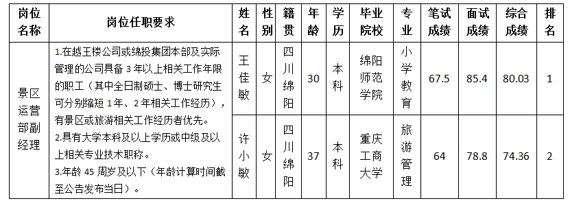 根據四川越王樓文化傳播有限公司發(fā)布的招聘公告及招聘相關規(guī)定,經筆試、面試等程序,現(xiàn)將筆試(面試)成績予以公示。