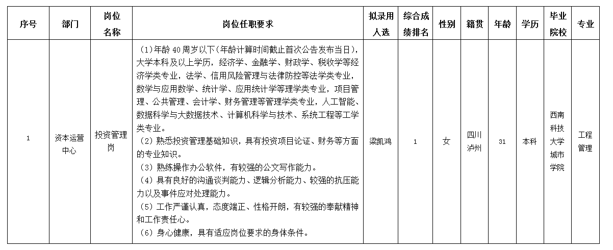 根據(jù)綿陽市投資控股(集團(tuán))有限公司發(fā)布的招聘公告及招聘相關(guān)規(guī)定,經(jīng)筆試、面試、背調(diào)等程序,擬錄用梁凱鴻同志到綿陽市投資控股(集團(tuán))有限公司工作,現(xiàn)予以公示,具體情況如下: