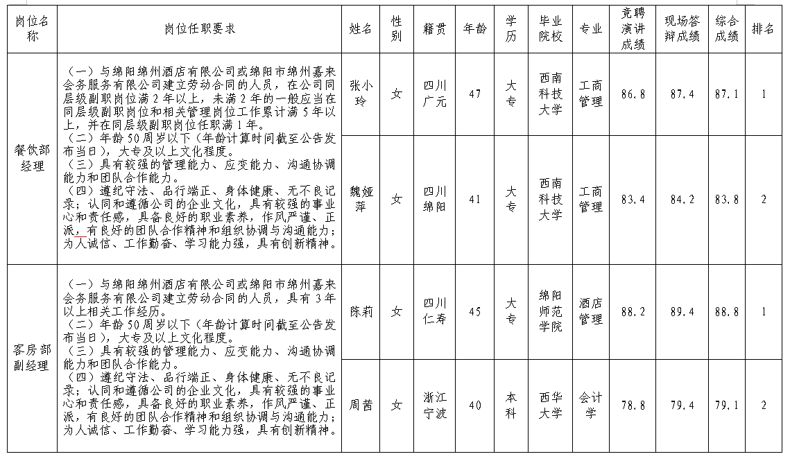 根據(jù)綿陽綿州酒店有限公司發(fā)布的招聘公告及招聘相關(guān)規(guī)定,經(jīng)競聘演講、現(xiàn)場答辯等程序,現(xiàn)將競聘成績予以公示。