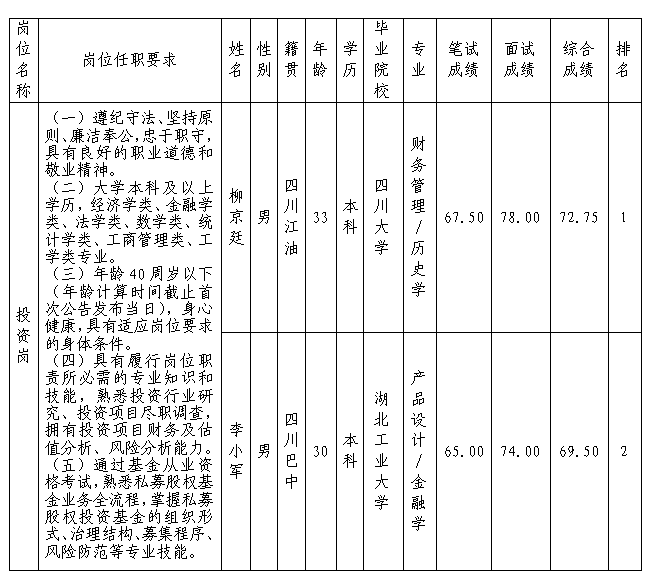 根據(jù)綿陽綿投私募基金管理有限公司發(fā)布的招聘公告及招聘相關規(guī)定,經(jīng)筆試、面試等程序,現(xiàn)將內(nèi)部選聘成績予以公示。