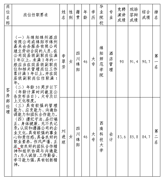 根據(jù)綿陽市綿州嘉來會務(wù)服務(wù)有限公司發(fā)布的招聘公告及招聘相關(guān)規(guī)定,經(jīng)競聘演講、現(xiàn)場答辯等程序,現(xiàn)將競聘成績予以公示。