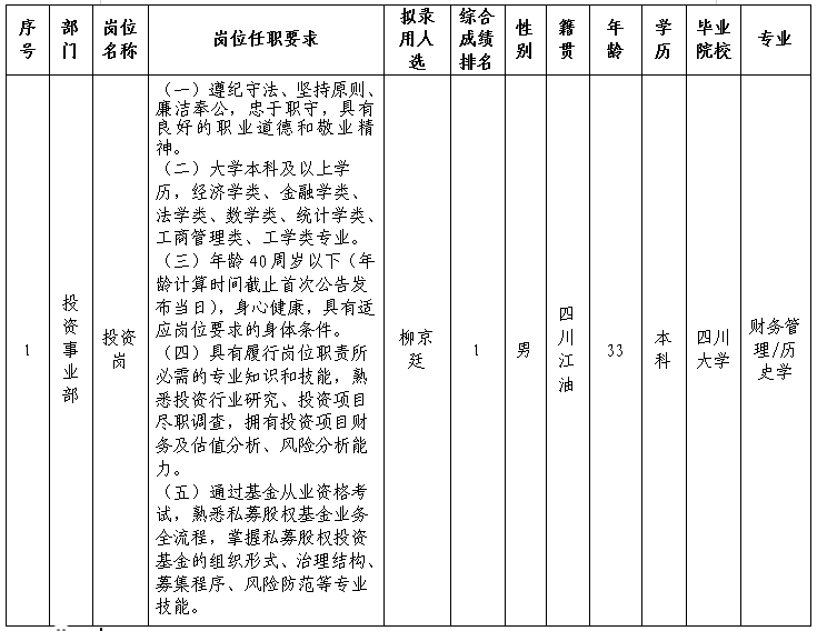 根據(jù)綿陽綿投私募基金管理有限公司發(fā)布的招聘公告及招聘相關規(guī)定,經(jīng)筆試、面試、背調(diào)等程序,擬錄用柳京廷同志到綿陽綿投私募基金管理有限公司工作,現(xiàn)予以公示,具體情況如下: