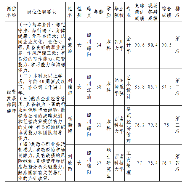 根據(jù)四川西津物有限責(zé)任公司發(fā)布的招聘公告及招聘相關(guān)規(guī)定,經(jīng)競(jìng)聘演講、現(xiàn)場(chǎng)答辯等程序,現(xiàn)將競(jìng)聘成績(jī)予以公示。