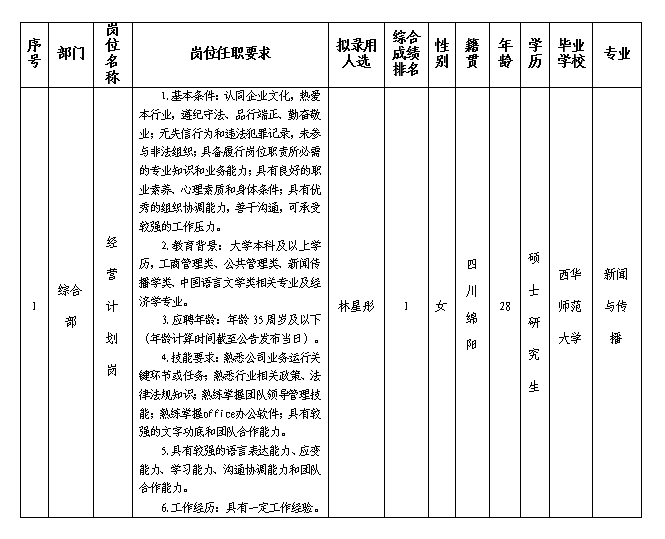 根據(jù)綿陽市城市停車管理有限公司發(fā)布的招聘公告及招聘相關(guān)規(guī)定,經(jīng)筆試、面試、背調(diào)、體檢等程序,擬錄用林星彤到綿陽市城市停車管理有限公司工作,現(xiàn)予以公示,具體情況如下:
