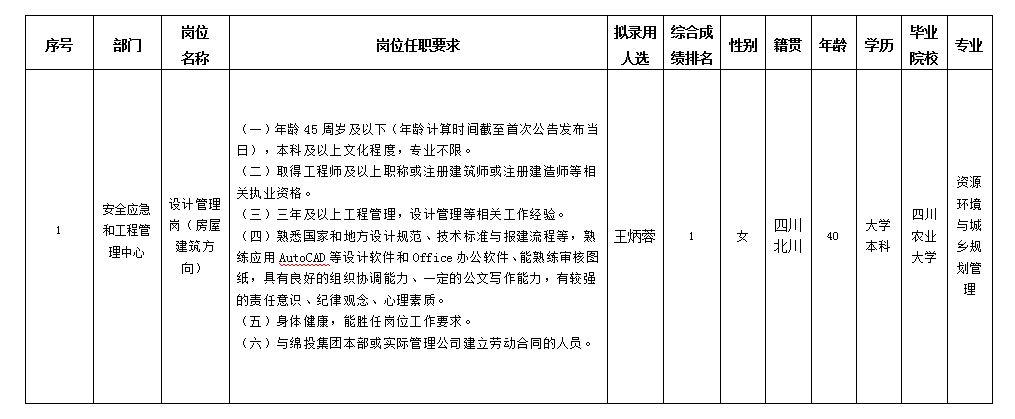 根據(jù)綿陽市投資控股(集團(tuán))有限公司發(fā)布的招聘公告及招聘相關(guān)規(guī)定,經(jīng)筆試、面試、背調(diào)等程序,擬錄用王炳蓉同志到綿陽市投資控股(集團(tuán))有限公司工作,現(xiàn)予以公示,具體情況如下: