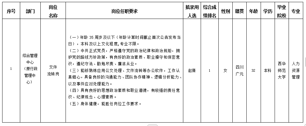 根據(jù)綿陽(yáng)市投資控股(集團(tuán))有限公司發(fā)布的招聘公告及招聘相關(guān)規(guī)定,經(jīng)筆試、面試、背調(diào)等程序,擬錄用趙倩同志到綿陽(yáng)市投資控股(集團(tuán))有限公司工作,現(xiàn)予以公示,具體情況如下: