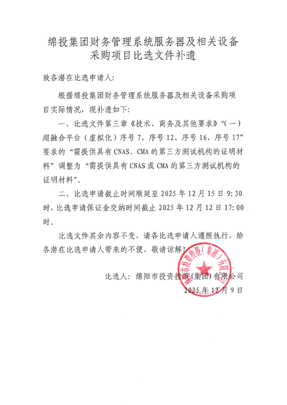 綿投集團財務(wù)管理系統(tǒng)服務(wù)器及相關(guān)設(shè)備采購項目比選文件補遺
