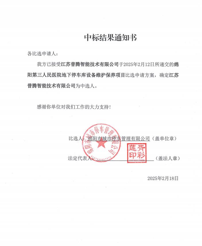 綿陽(yáng)第三人民醫(yī)院地下停車庫(kù)設(shè)備維護(hù)保養(yǎng)項(xiàng)目中標(biāo)結(jié)果通知書