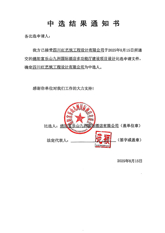綿陽(yáng)富樂山九洲國(guó)際酒店多功能廳建設(shè)項(xiàng)目設(shè)計(jì)中選結(jié)果通知