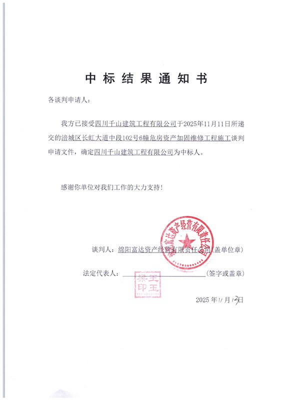 涪城區(qū)長虹大道中段102號6幢危房資產(chǎn)加固維修工程施工中標結(jié)果通知
