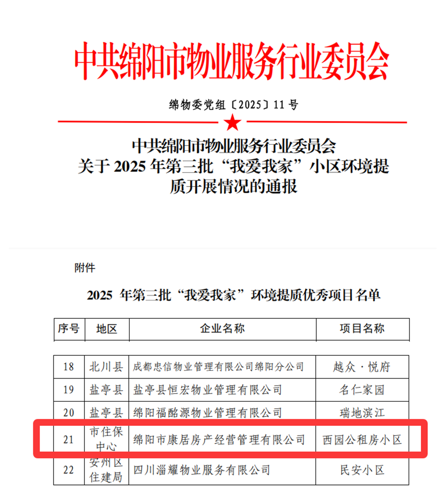 近日,綿陽(yáng)市物業(yè)服務(wù)行業(yè)協(xié)會(huì)通報(bào)表?yè)P(yáng)2025年第三批“我愛(ài)我家”小區(qū)環(huán)境提質(zhì)優(yōu)秀項(xiàng)目,西園公租房小區(qū)榜上有名。成績(jī)的取得,是對(duì)康居公司踐行“三心”服務(wù),即:以住戶為核心、與住戶貼心、讓住戶放心的有力佐證。
